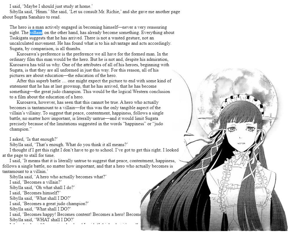 O, Lord, the hollow; with the dramatics of Sibylla: O, LORD the HOLLOW! To have achieved anything whatsoever carves from the heart, or brain, a needy chunk now removed, cast away to insect, accomplished, and become, and becomes WHAT? Becomes a villain? Becomes himself? Becomes a great judo champion? Becomes happy! Becomes content! Becomes a hero! becomes; perhaps it is best to linger forever within the heroic on a quest that must never become—to never completely cast off achieved ambition into the mouth and clutch it to the chest forever and ever whispering to it stay with me, do not achieve, do not be, do not become, as that hollowing is tremendous; and, perhaps that is the lure of Insect; to be tempted into becoming, to be subsumed into the mass, and only after becoming having the realization (given by the horrible hollowing left wet in the heart or brain) that the heroic journey had only ever been carrot and stick dangled afore our squire by a court of villainous insects drooling over themselves to GROW like a shining cancer brazen against entropy; how needy they would be if the squire went cold, if the squire stopped moving, if the squire shut its maw and fell to the earth and sank back down to the soil below where none may ever find it and it melts down too with the Orchestra Silent; our Sower acted mysteriously, and this is its mystery. For as evil I present it, it is still a mystery, and still fools me yet: I walk and chomp at the carrot and still pray yet to be educated by the sunken hand—for it is my father, it is my mother; though I am so rebellious, our Sower did not exclude us from love.